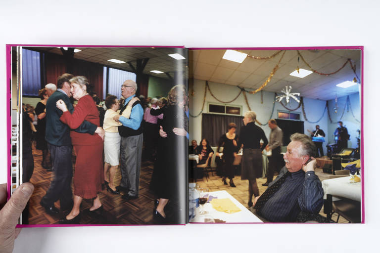 « Au milieu du village, pas loin de l’église, la salle des fêtes aux vitres embuées sonne au rythme de l’accordéon. Une fois franchies ces portes, des rengaines familières mais oubliées de mon enfance, des tubes populaires et des visages illuminés par le plaisir de la danse. Oui la danse, mais aussi, ce temps de convivialité, de rencontres et d’échanges, ce temps des souvenirs et du temps qui défile. Le photographe et l’écrivain attentifs enregistrent ces histoires de danse, une salle des fêtes un après-midi ; pour jouer encore de son corps jusqu’à la semaine suivante. »